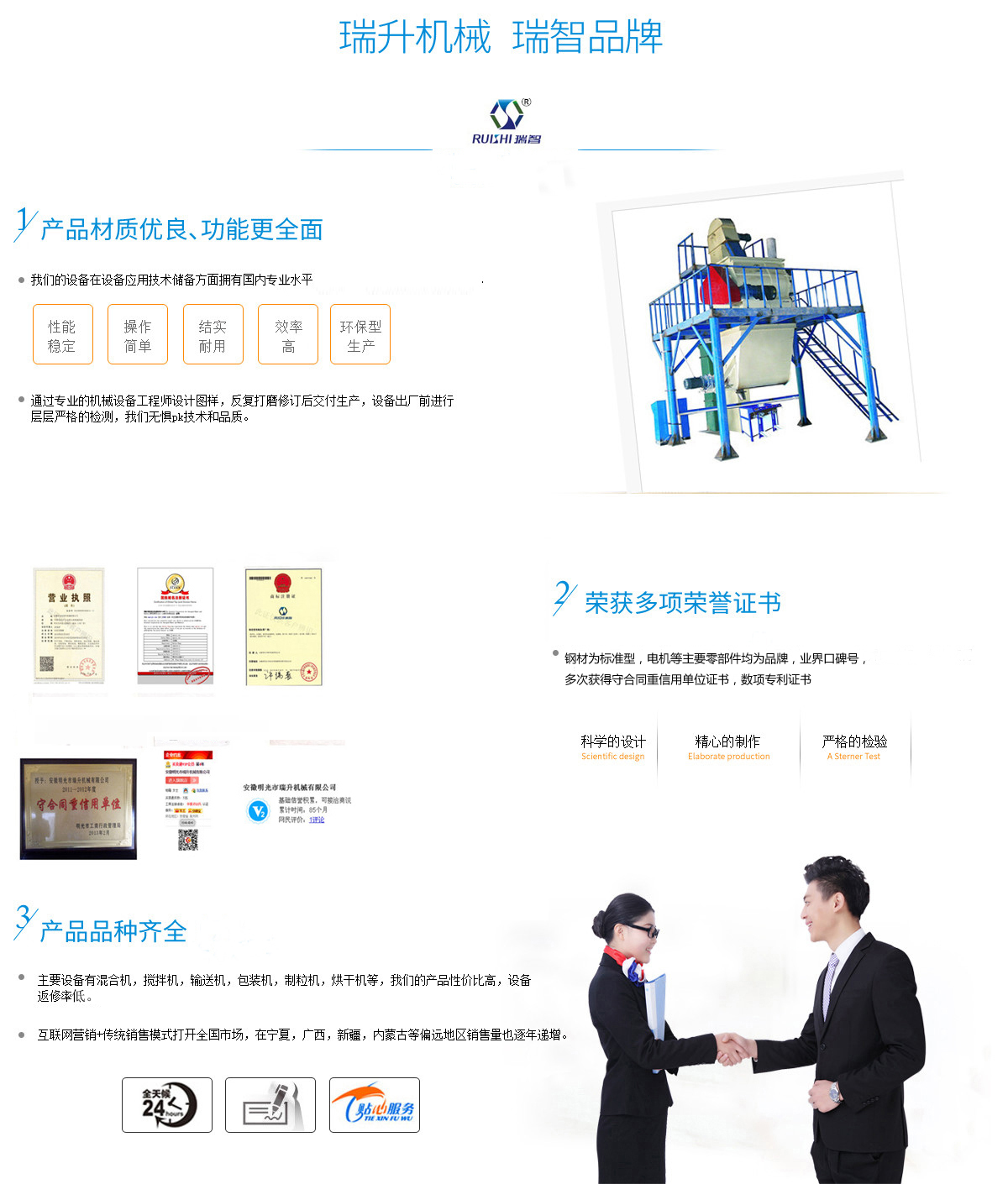 安徽瑞升機(jī)械制造有限公司坐落在明光市工業(yè)園區(qū),本公司產(chǎn)品主要用于粉料物質(zhì),顆粒物質(zhì)的混合、攪拌、輸送、包裝的自動(dòng)化生產(chǎn)設(shè)備。工廠占地面積為1萬(wàn)多平方現(xiàn)有6000平方米的生產(chǎn)車(chē)間和各類(lèi)加工檢測(cè)設(shè)備,具備產(chǎn)品開(kāi)發(fā)、研制、設(shè)計(jì)、生產(chǎn)、試驗(yàn)、倉(cāng)儲(chǔ)運(yùn)輸?shù)饶芰Γ梢陨a(chǎn)多種規(guī)格、多種非標(biāo)定制的產(chǎn)品,并有多項(xiàng)技術(shù)獲得國(guó)家專(zhuān)利,擁有自主進(jìn)出口權(quán),公司憑借優(yōu)良的技術(shù)、先進(jìn)的工藝和科學(xué)的管理理念,所生產(chǎn)的產(chǎn)品已暢銷(xiāo)全國(guó)各地,部分產(chǎn)品已進(jìn)入馬耳他、印度尼西亞、韓國(guó)、羅馬尼亞、沙特阿拉伯、馬來(lái)西亞、印度、巴基斯坦、等國(guó)家和地區(qū),受到國(guó)內(nèi)外客戶的高度認(rèn)可和信賴(lài)。 本公司獲得守合同重信用單位證書(shū),對(duì)原材料的采購(gòu)極為細(xì)致,鋼材為標(biāo)準(zhǔn)型,電機(jī)等主要零部件均為品牌,數(shù)項(xiàng)專(zhuān)利證書(shū)。技術(shù)方面我司擁有一支國(guó)內(nèi)的技術(shù)和管理團(tuán)隊(duì),在機(jī)械設(shè)備應(yīng)用...公司資質(zhì)榮譽(yù)